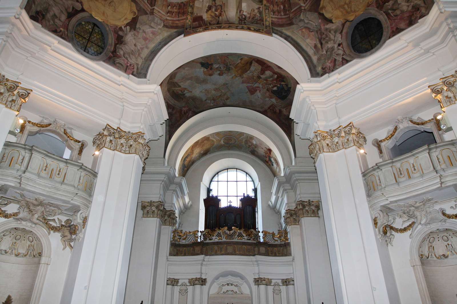 En dehors de la monumentale fresque, vous avez 3 autres fresques plus petites. Au-dessus de la tribune d'orgue, d'un côté, vous pouvez voir St Jean, ligoté comme une rosette de Lyon et martyrisé. De l'autre côté est représenté son jetage dans le fleuve Vltava depuis le pont Charles. Au-dessus du hall d'entrée, entre la tribune d'orgue et la coupole principale, est représenté le retrouvage de St Jean sur les bords du fleuve, tout gonflé comme une grosse jubarte, les mouettes dessus attablées. Puis il est encore une fresque au-dessus du retable de l'autel, représentant 2 petits anges montant vers les cieux avec la langue de porc... de St Jean, attribut exclusif et à lui spécifique.